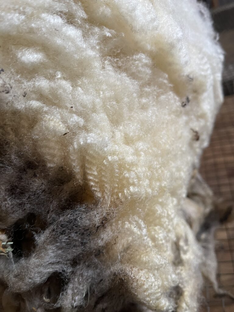 I am going to separate and skirt each fleece. I’m getting a table prepared to work on this. Thinking I might start with a tarp first, and then see if I’ve got a frame to work on it or put chicken wire over. These are pictures of photos I used when comparing the fleece to each other. These are pictures of the ones I brought home, although I have others I took pictures of. I used chatGPT to help me choose and select the best fleeces of the one I selected to look at. I agreed with him on the first selection, and the second, I wasn’t sure about but decide he had been right on the first.